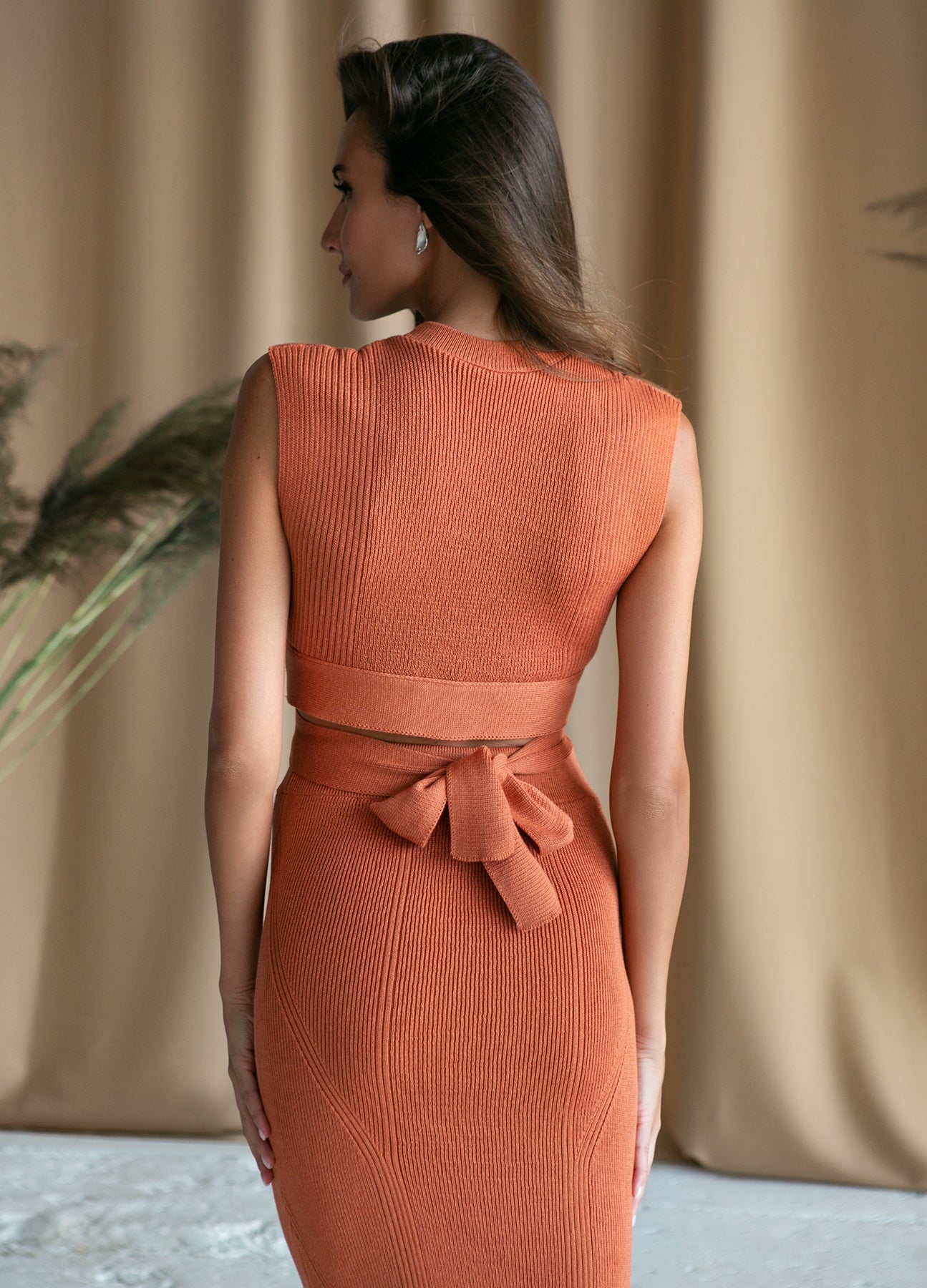 Elegant Ribbed Knit Midi Pencil Skirt Terracotta