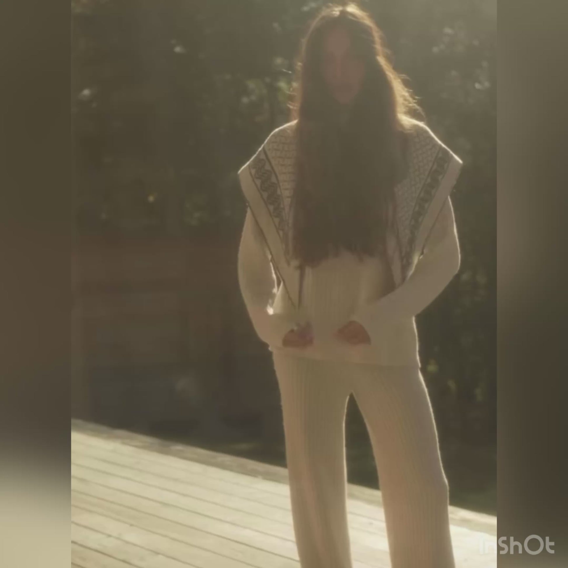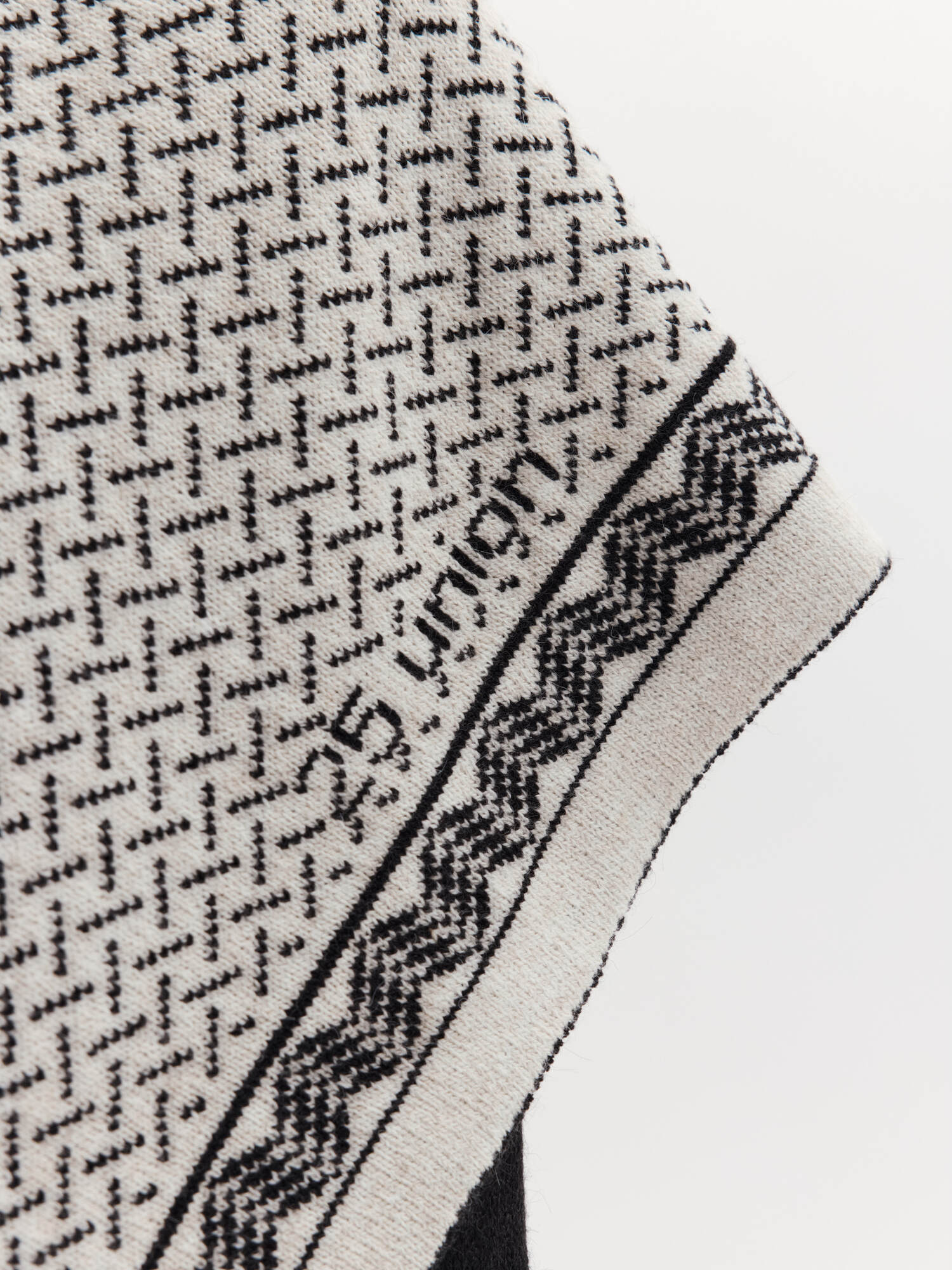 A triangular scarf with an ornamental pattern, crafted from warm and soft yarn. Made with jacquard knitting, allowing it to be worn on either side. The scarf features a knitted brand logo. A trendy accessory that can be styled on the head, shoulders, or waist, adding versatility to your look. Perfectly complements the brand’s suits and dresses.