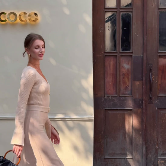 Knitted Belted V-neck Midi Dress Stephanie Cream